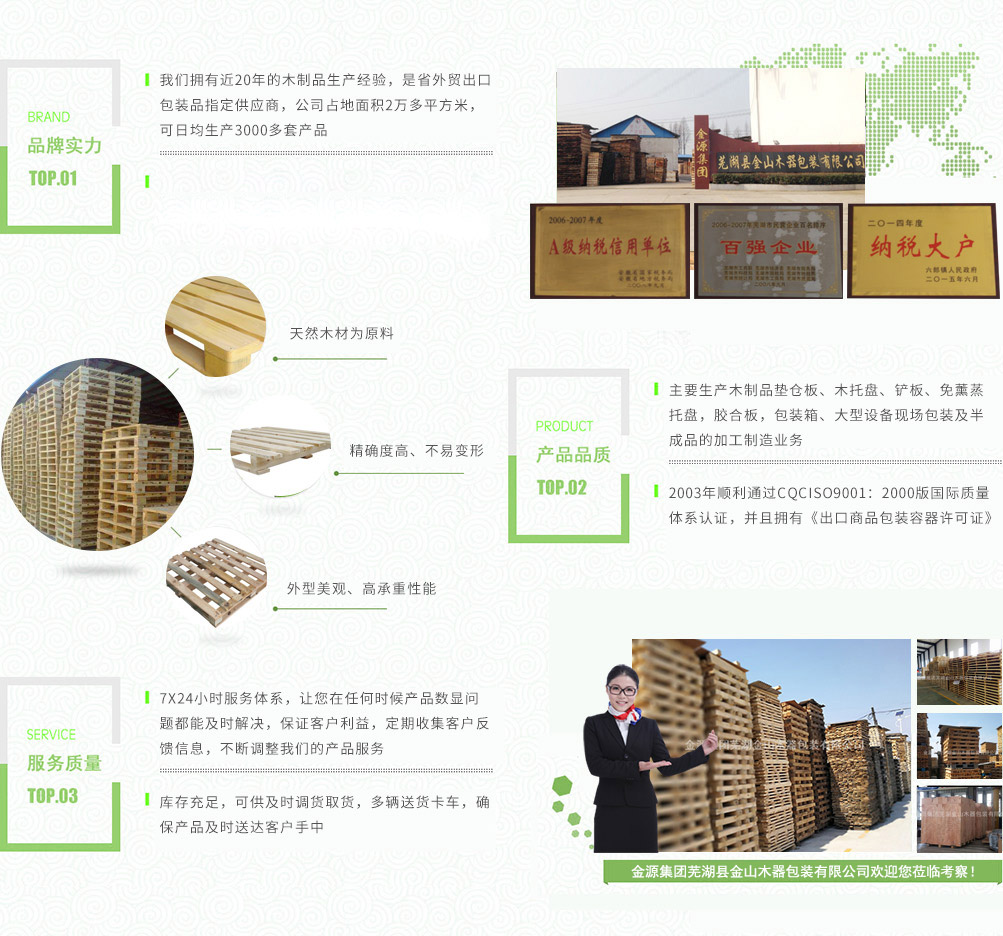 金源集團蕪湖金山木器包裝有限公司是省外貿出口包裝品指定的供應商,主要生產木制品墊倉板、木托盤、鏟板、免薰蒸托盤,膠合板,包裝箱、大型設備現場包裝及半成品的加工制造業(yè)務。產品廣泛用于物流,倉儲,港口,碼頭,機械,建材,化工,紡織,食品,超市,五金電器等行業(yè)。公司占地面積2萬多平方米,注冊資金壹佰壹拾捌萬圓整,公司擁有員工160多人,其中技術人員占25%,可日均生產3000多套產品,年產值6000多萬元,公司下轄木材加工廠,組裝廠,并備有大型標準烘房,多功能平板刨,壓刨,挖槽,機械設備等。產品主要銷往國內大中型城市并隨貨通行出口國外。